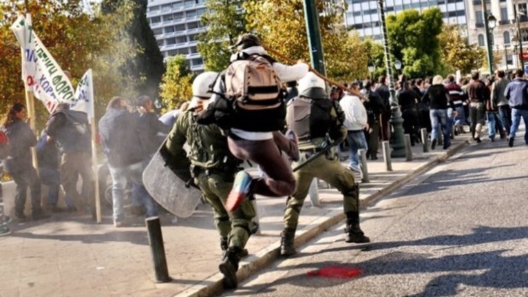 Ικανότητες νίντζα πρέπει να είχε ο αγρότης που φαίνεται στην φωτογραφία να επιτίθεται σε άνδρες των ΜΑΤ στο Σύνταγμα κατά τη διάρκεια του σημερινού συλλαλητηρίου