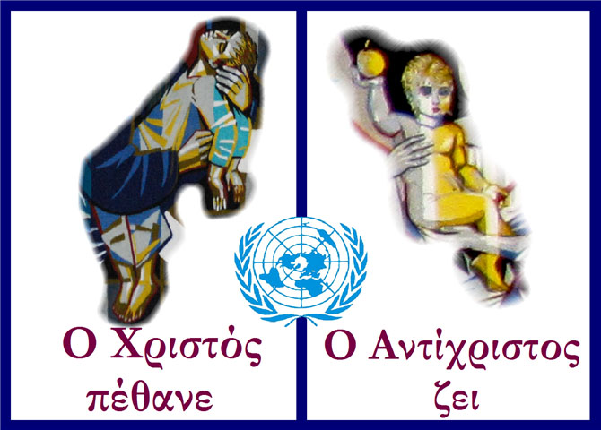 Δείτε και αυτόν τον πίνακα, (*) που υπάρχει μέσα στο κτήριο του ΟΗΕ, στην Νέα Υόρκη, όπου μέσα και από εκεί στἐλνει ο Αντίχριστος ξεκάθαρα, απροκάλυπτα και στεντορεία τη φωνή το διαβολικό μήνυμά του, ότι: