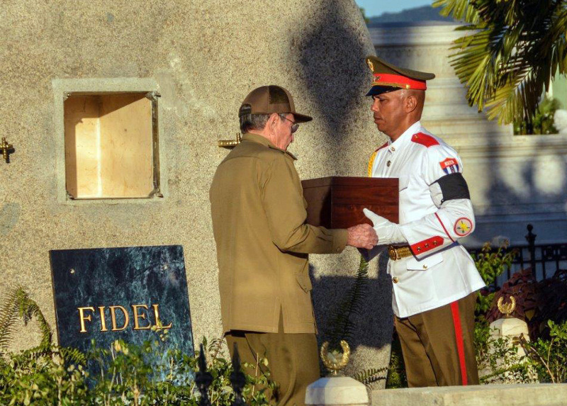 Ο Ραούλ Κάστρο τοποθέτησε το ξύλινο κουτί με την τέφρα του ηγέτη της Κουβανικής Επανάστασης, μέσα στο άνοιγμα που δημιουργήθηκε στην τεράστια αυτή πέτρα για να το «υποδεχθεί» ενώ από επάνω έκλεισε με το σφράγισμα μιας μαρμάρινης πλάκας που έφερε την επιγραφή: «Φιντέλ».