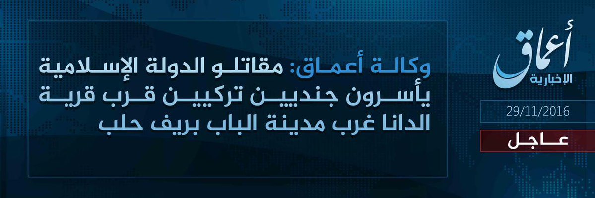 Ασχημη τροπή παίρνει η επιχείρηση «Ασπίδα του Ευφράτη» για την Τουρκία: Ο ISIS πριν λίγο ανακοίνωσε πως έχει αιχμαλωτίσει δύο Τούρκους στρατιώτες δυτικά της Al-Bab και θα δώσει πλάνα με αποκεφαλισμούς. Φαίνεται όμως ότι υπάρχει εμπλοκή μεταξύ Ρωσίας-Τουρκίας. Οι δύο τηλεφωνικές συνομιλίες Β.Πούτιν-Ρ.Τ.Ερντογάν ίσως δεν απέδωσαν τα αναμενόμενα για τον «Σουλτάνο».