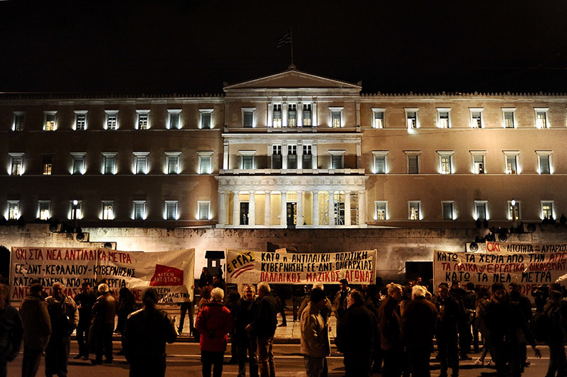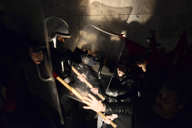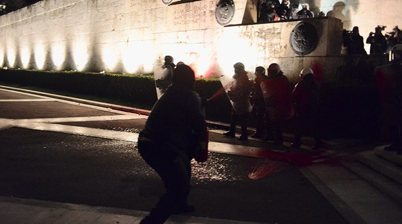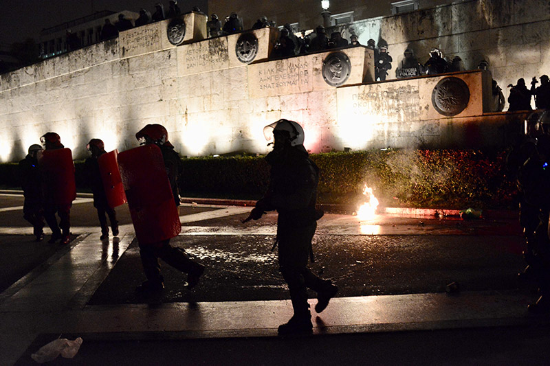 Η ένταση συνεχίστηκε και μετά τις 7:30 το απόγευμα, καθώς μικρές ομάδες αντιεξουσιαστών εφορμούσαν εναντίον των αστυνομικών που είχαν φράξει τις εισόδους της Βουλής, πετώντας πέτρες και φωτοβολίδες. Η ομάδα αυτή των 50 ατόμων που πραγματοποιούν σποραδικές επιθέσεις, έχει σπάσει μάρμαρα και άλλα υλικά από τους γύρω δρόμους και τα πετάει εναντίον των αστυνομικών, οι οποίοι με τη σειρά τους τηρούν στάση άμυνας, κάνοντας χρήση χημικών όταν οι επιτιθέμενοι πλησιάζουν σε κοντινή απόσταση.
