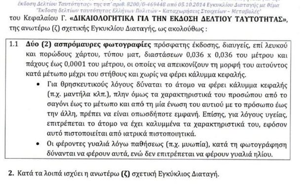 Ενώ αρχικά σημειώνει ότι ο αιτών στην έκδοση της ταυτότητας δεν πρέπει να φέρει κάλυμμα κεφαλής, όπερ ίσχυε μέχρι σήμερα, υπάρχει υποσημείωση, η οποία επιτρέπει τις μαντήλες – με ειδική οριοθέτηση.