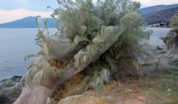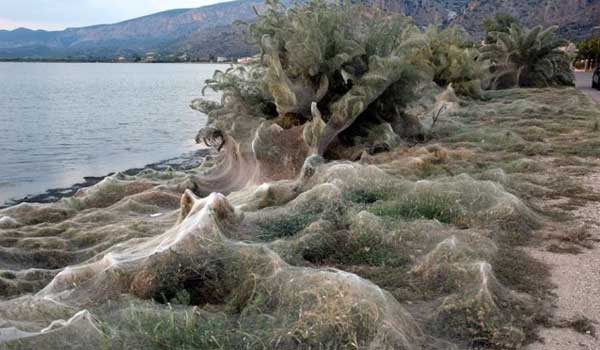 Ένα περίεργο και πρωτόγνωρο θέαμα αντίκρισαν ντόπιοι και τουρίστες στο Αιτωλικό. Συγκεκριμένα στην ανατολική παραλία της λιμνοθάλασσας, πριν την γέφυρα, υπάρχει ένα τεράστιο πέπλο από ιστούς που έφτιαξαν αράχνες που έχει καλύψει τα φυτά (φοίνικες, αρμυρίκια και ποώδη βλάστηση) σε μήκος