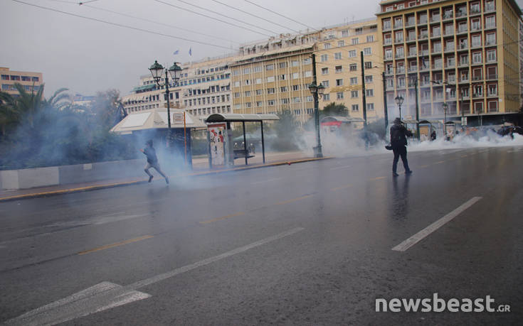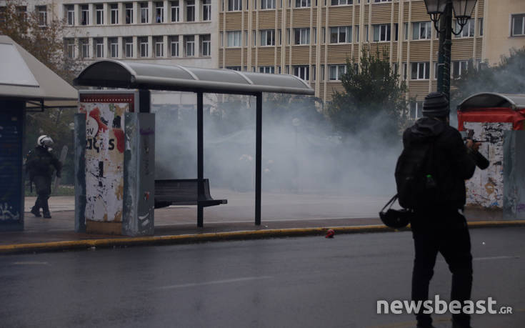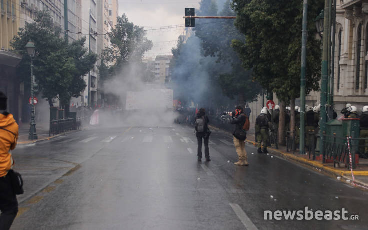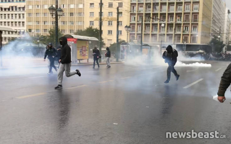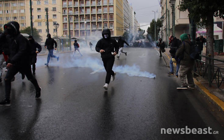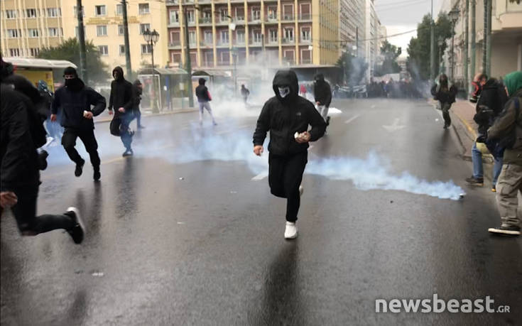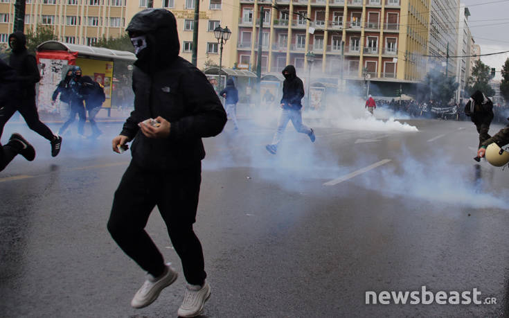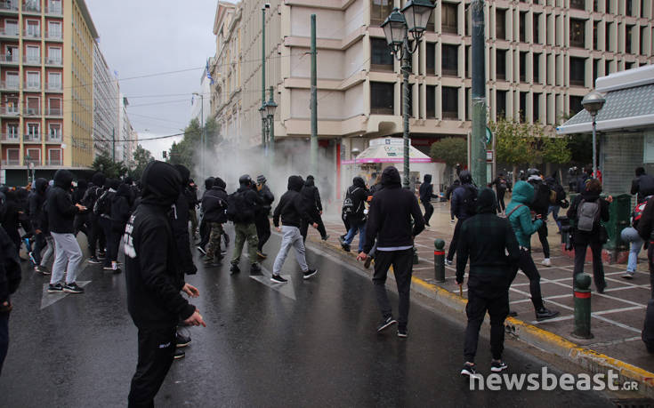 Καθώς ανέβαινε η πορεία προς τη Σταδίου, στο ύψος της Κλαυθμώνος, κουκουλοφόροι πέταξαν πέτρες και βόμβες μολότοφ στις αστυνομικές δυνάμεις που απάντησαν με χρήση χημικών. Κάποιοι νεαροί κρατούσαν πυροσβεστήρες και βαριοπούλες και έσπασαν τζαμαρίες καταστημάτων, αλλά και στάσεις λεωφορείων.