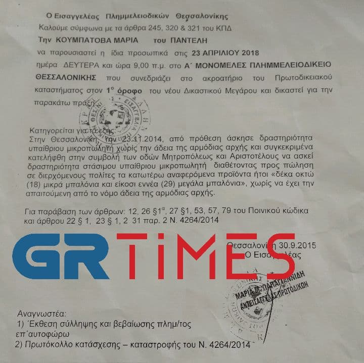 Όλα συνέβησαν το 2014 όταν η 78χρονη τότε κ. Μαρία, χωρίς κανένα εισόδημα και με ανάγκη να αγοράζει φάρμακα αποφάσισε για να μπορέσει να εξασφαλίσει τα προς το ζην να πάρει τα τερλίκια που έπλεξε και να τα πουλήσει στην πλατεία Αριστοτέλους. Πριν καλά καλά «στήσει» το εμπόρευμα της σε αυτοσχέδιο πάγκο την συνέλαβαν. Όπως εξηγεί στο GRTimes.gr είναι κάτι που δεν θα ξεχάσει ποτέ στη ζωή της. Σύμφωνα με την κόρη της οι αστυνομικοί την έσυραν στο Αστυνομικό Τμήμα Λευκού Πύργου, όπου η γιαγιά παρέμεινε για εννέα ολόκληρες ώρες, λιποθύμησε και έκλαιγε συνεχώς. Την επόμενη ημέρα η κόρη της η οποία βρέθηκε από την πρώτη στιγμή στο πλευρό της είδε το πρόστιμο που της επιβλήθηκε. Πήγε στην Αστυνομία, όπου την διαβεβαίωσαν πως δεν θα κληθεί να πληρώσει κάτι. Μετά από έξι μήνες διαπίστωσε ότι το πρόστιμο δεν είχε «σβηστεί». Επισκέφτηκε τα Δικαστήρια, την Αστυνομία, το ΙΚΑ, την Περιφέρεια, Δικηγόρους και Λογιστές οι οποίοι δεν μπόρεσαν να κάνουν κάτι.