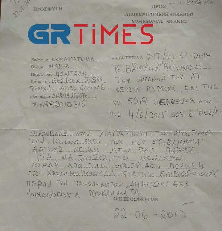 Μέσω του GRTimes.gr η 82χρονη σήμερα Μαρία Κουμπάτοβα, ομογενής από την Ρωσία απευθύνει έκκληση στις αρμόδιες Αρχές να της «σβήσουν» το πρόστιμο των 10.000 ευρώ που της επιβλήθηκε πριν από πέντε χρόνια όταν συνελήφθη από αστυνομικούς στην πλατεία Αριστοτέλους να πουλά τερλίκια. Έκπληκτη η κόρη της κ. Μαρίας, Τάμαρα Σαρίδου διαπίστωσε πριν λίγες ημέρες όταν θέλησε να υποβάλει την φορολογική δήλωση της μητέρας της πως στα 10.000 ευρώ προστέθηκαν άλλα 3.358 ευρώ τόκοι. Το χρέος που καλείται να πληρώσει η 82χρονη γιαγιά είναι θηλιά στο λαιμό, αφού όπως ισχυρίζεται ξυπνά και κοιμάται με αυτό το άγχος.