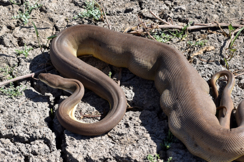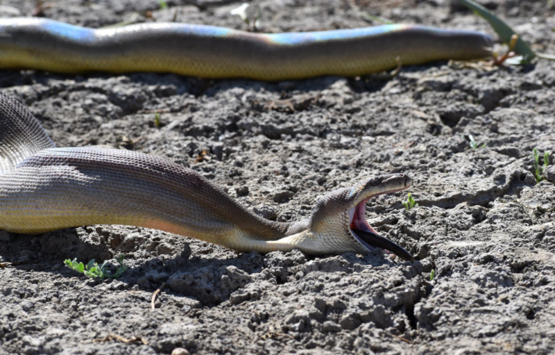Ένας πύθωνας τεσσάρων μέτρων, αφού προσπάθησε χωρίς επιτυχία να χωνέψει έναν ακόμα μεγαλύτερο πύθωνα, άρχισε τις προσπάθειες να αποβάλει το θήραμά του,