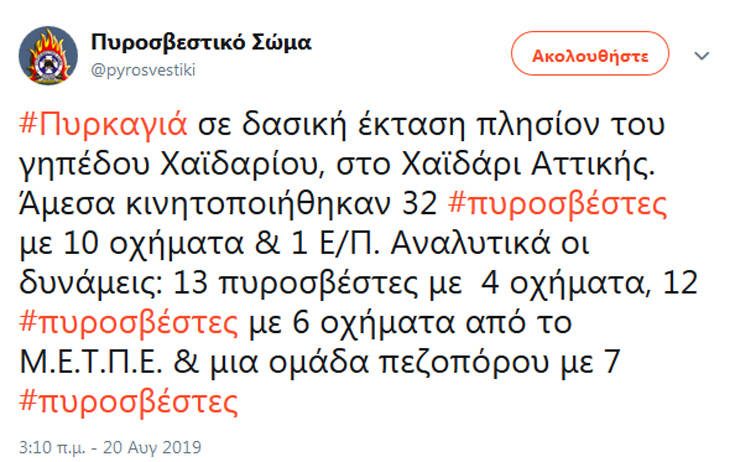 Πυρκαγιά σε δασική έκταση, κοντά στο γήπεδο του Χαϊδαρίου, βρίσκεται αυτήν τη στιγμή σε εξέλιξη, σύμφωνα με την ενημέρωση της Πυροσβεστικής Υπηρεσίας.