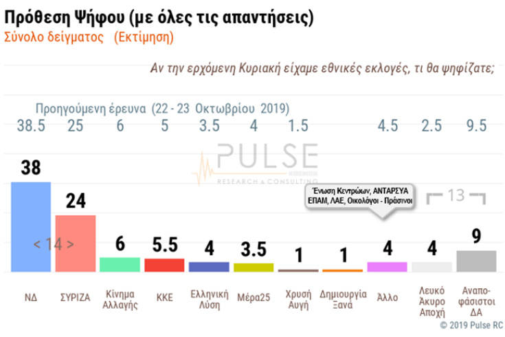 38%, 24% είναι η προτίμηση στον ΣΥΡΙΖΑ, 6% στο ΚΙΝΑΛ, 5,5% στο ΚΚΕ, 4% στην Ελληνική Λύση και 3,5% στο ΜέΡΑ25, ενώ οι αναποφάσιστοι κυμαίνονται στο 9%.