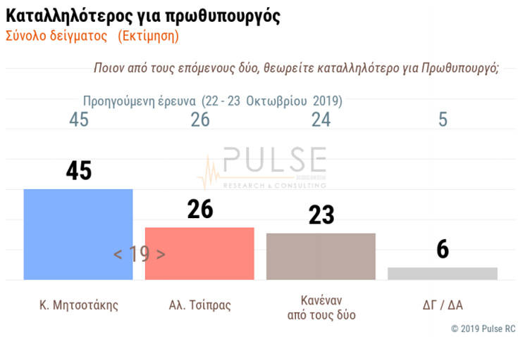 Καταλληλότερος για πρωθυπουργός παραμένει ο Κυριάκος Μητσοτάκης με 45% έναντι 26% του Αλέξη Τσίπρα, στο 23% κυμαίνεται η απάντηση «κανένας από τους δύο».
