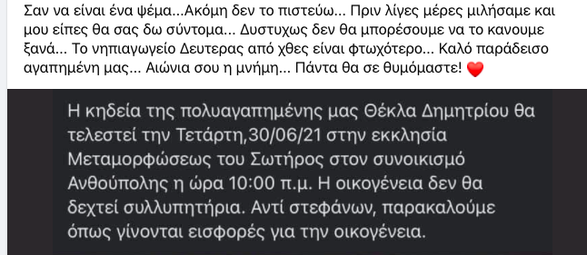 Σαν κεραυνός εν αιθρία ο θάνατος της 42χρονης Θέκλας Δημητρίου, στα αγαπημένα της πρόσωπα, που δεν μπορούν να πιστέψουν τον χαμό της.