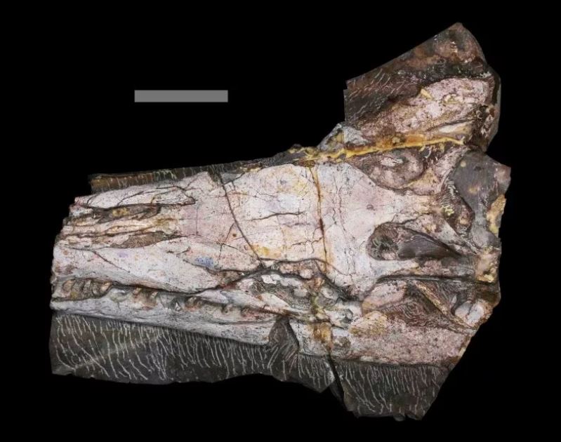 Μια φωτογραφία που δείχνει τα απολιθωμένα υπολείμματα του Yaguarasaurus regiomontanus—συμπεριλαμβανομένου ενός σχεδόν πλήρους κρανίου και σιαγόνων. Το απολίθωμα βρέθηκε στην πολιτεία Nuevo León, στο βορειοανατολικό Μεξικό.