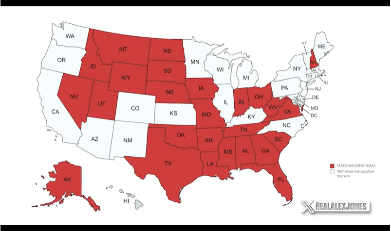Η Ένωση Ρεπουμπλικανών Κυβερνητών (RGA) δημοσίευσε λίστα των πολιτειών υπό την ηγεσία του Ρεπουμπλικανού Κόμματος, που προσφέρουν υποστήριξη στο Τέξας, κόντρα στην διεθνιστική εξουσία της Ουάσινγκτον, καθώς η Πολιτεία των ΗΠΑ διεξάγει «πόλεμο» με την κυβέρνηση Μπάιντεν για το δικαίωμα υπεράσπισης των συνόρων του από τις ορδές αλλοδαπών!