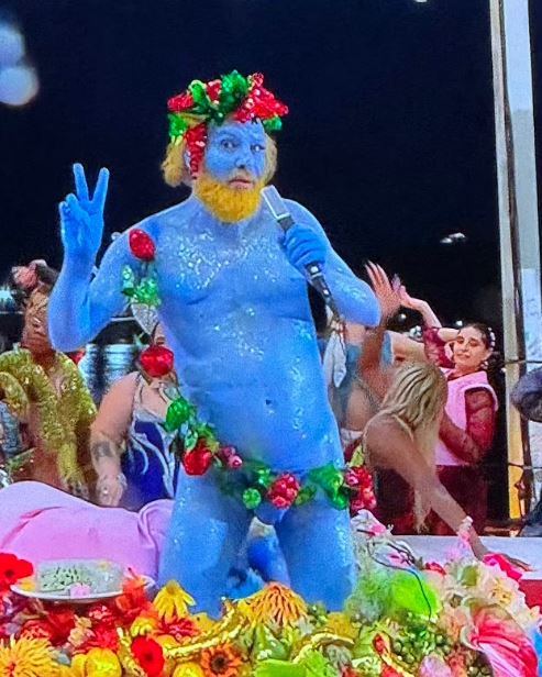 Ο Phillippe Katerine φορούσε ένα στενό μπλε κορμάκι που άφηνε ελάχιστα στη φαντασία, και τον είδαν να αναπαύεται σε μια γιγαντιαία πιατέλα που ήταν στρωμένη με ψεύτικα φρούτα και άλλα τρόφιμα.
