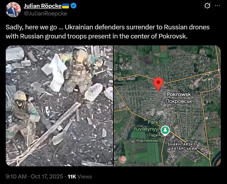 Σε πλάνα που αναδημοσίευσαν και Ουκρανοί, διακρίνεται η στιγμή της παράδοσης των στρατιωτών, στο κέντρο – όπως αναφέρεται – του Ποκρόβσκ, εκεί όπου η ρωσική παρουσία πλέον είναι έντονη.