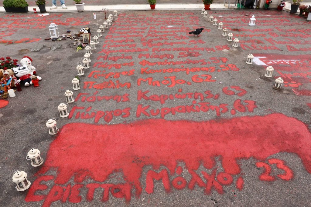 Η ομάδα «Μέχρι Τέλους» έχει στήσει αυτοσχέδιο μνημείο για τα θύματα των Τεμπών, γράφοντας τα ονόματα των 57 νεκρών με κόκκινη μπογιά μπροστά από τη Βουλή.