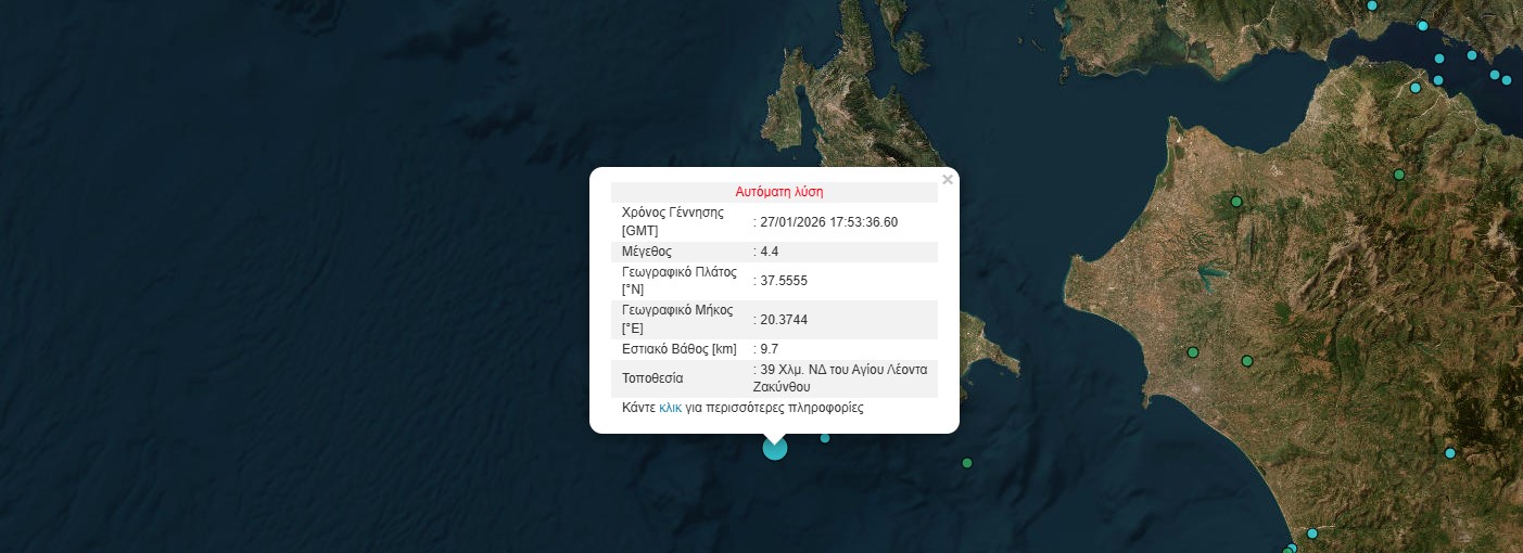 Σύμφωνα με την αυτόματη λύση του γεωδυναμικού Ινστιτούτου το επίκεντρο της δόνησης εντοπίζεται στα 39 Χλμ. Νοτιοδυτικά του Αγίου Λέοντα Ζακύνθου, ενώ το εστιακό βάθος υπολογίζεται στα 9,7 χλμ.