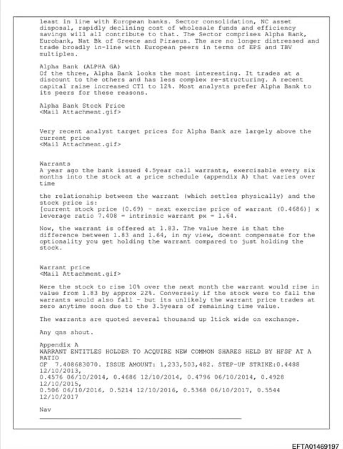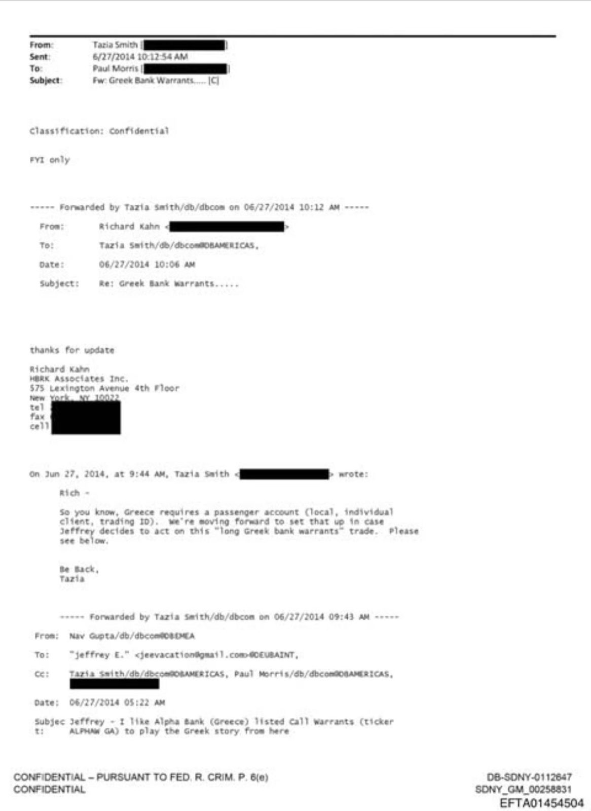 Ο Έπσταϊν ενημερώθηκε για πιθανές επενδύσεις σε τίτλους κτήσης μετοχών (warrants) ελληνικών τραπεζών. Η Tazia Smith ανέφερε τη δημιουργία τοπικών λογαριασμών προκειμένου να προετοιμαστούν συναλλαγές σε «μακρόχρονους ελληνικούς τραπεζικούς τίτλους κτήσης μετοχών».