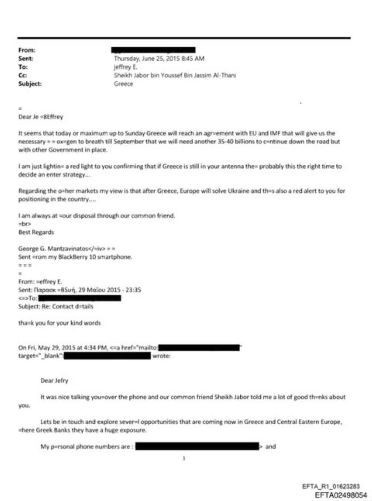 Ο Έπσταϊν είχε αλληλογραφία και με τον εκλιπόντα George G. Mantzavinatos σχετικά με τον χρονισμό επενδύσεων και τις επενδυτικές ευκαιρίες στην Ελλάδα και την Κεντρική και Ανατολική Ευρώπη. Ο Mantzavinatos εκτιμούσε ότι η Ελλάδα πιθανότατα θα κατέληγε σε συμφωνία με την ΕΕ και το ΔΝΤ έως τα τέλη Ιουνίου 2015, γεγονός που θα εξασφάλιζε προσωρινή χρηματοπιστωτική σταθερότητα έως τον Σεπτέμβριο, οπότε θα απαιτούνταν επιπλέον 35–40 δισ. ευρώ.