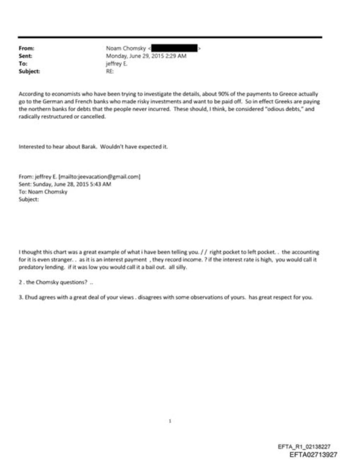 Σε ένα εκτενές email προς τον Νόαμ Τσόμσκι, ο Έπσταϊν αναλύει τον τρόπο λειτουργίας του τραπεζικού συστήματος και του ελληνικού προγράμματος διάσωσης.