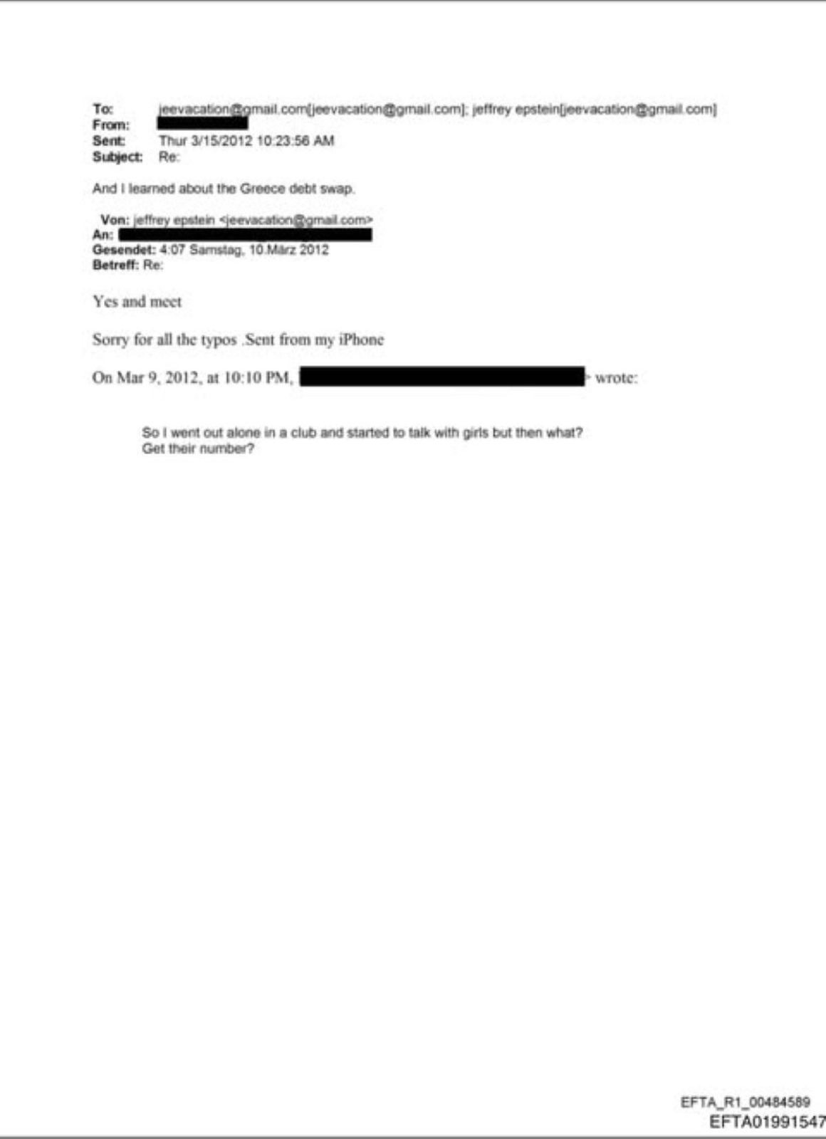 Σε αλληλογραφία του Μαρτίου 2012, ο Έπσταϊν αναφέρεται στο πως έμαθε για τα swaps του ελληνικού χρέους (debt swaps).