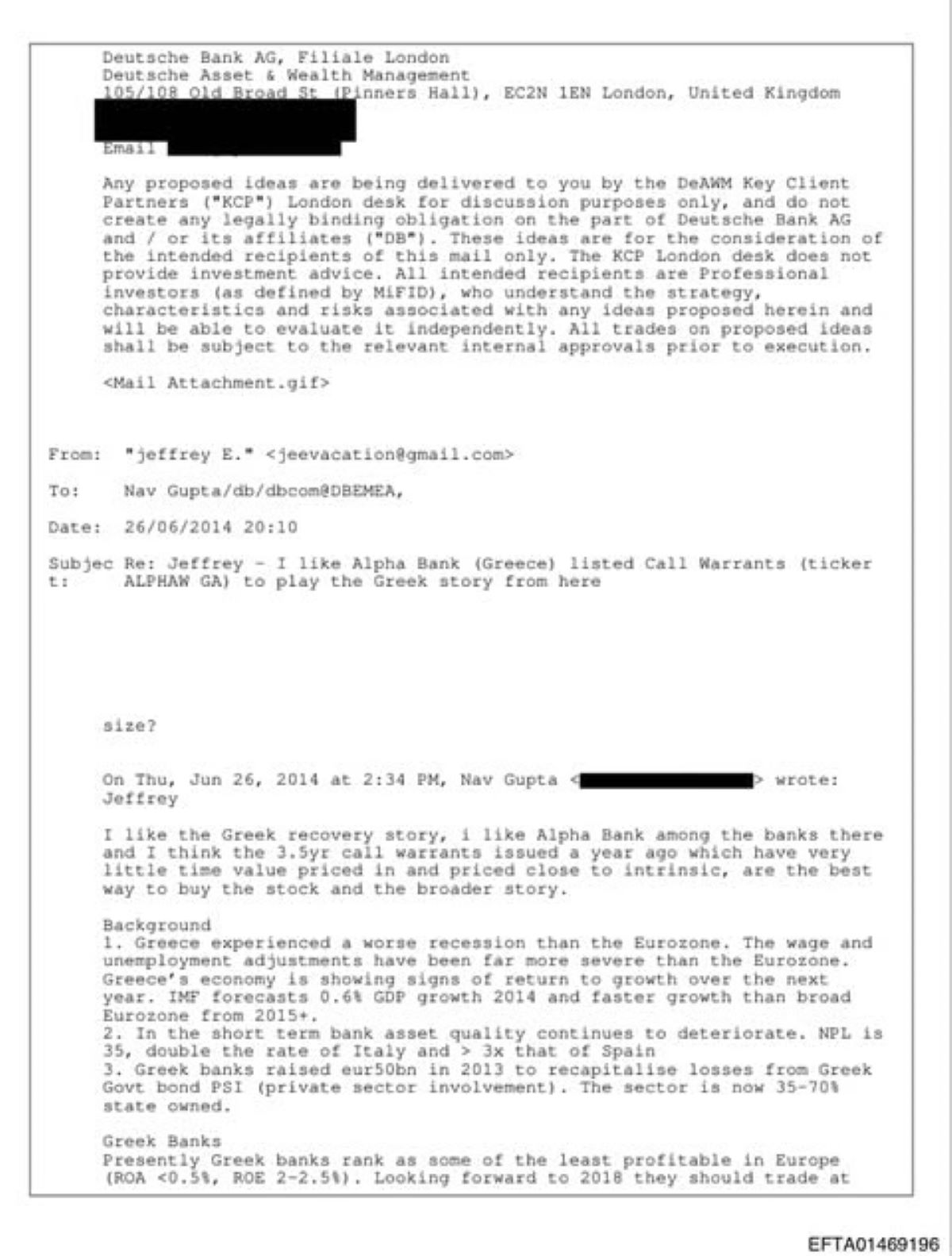 Υποστήριζε ότι αυτή η χρονική συγκυρία αποτελούσε ευκαιρία για τον Έπσταϊν να εξετάσει την είσοδό του στην ελληνική αγορά, ιδιαίτερα στον τραπεζικό τομέα και σε τράπεζες με μεγάλα «ανοίγματα». Παράλληλα, επισήμαινε και άλλους γεωπολιτικούς κινδύνους, όπως η κατάσταση στην Ουκρανία, υποδεικνύοντας και ποιες ήταν οι ευρύτερες επενδυτικές παράμετροι στην Ευρώπη.