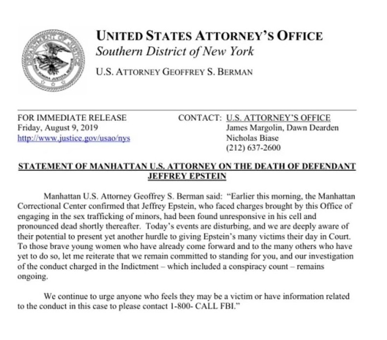 Σύμφωνα με την Daily Mail, η δήλωση προέρχεται από το Γραφείο του Εισαγγελέα των ΗΠΑ για τη Νότια Περιφέρεια της Νέας Υόρκης και φέρει την ημερομηνία Παρασκευή 9 Αυγούστου 2019. Στο κείμενο αναφέρεται ρητά ότι ο Έπσταϊν είχε ήδη βρεθεί αναίσθητος και είχε κηρυχθεί νεκρός.