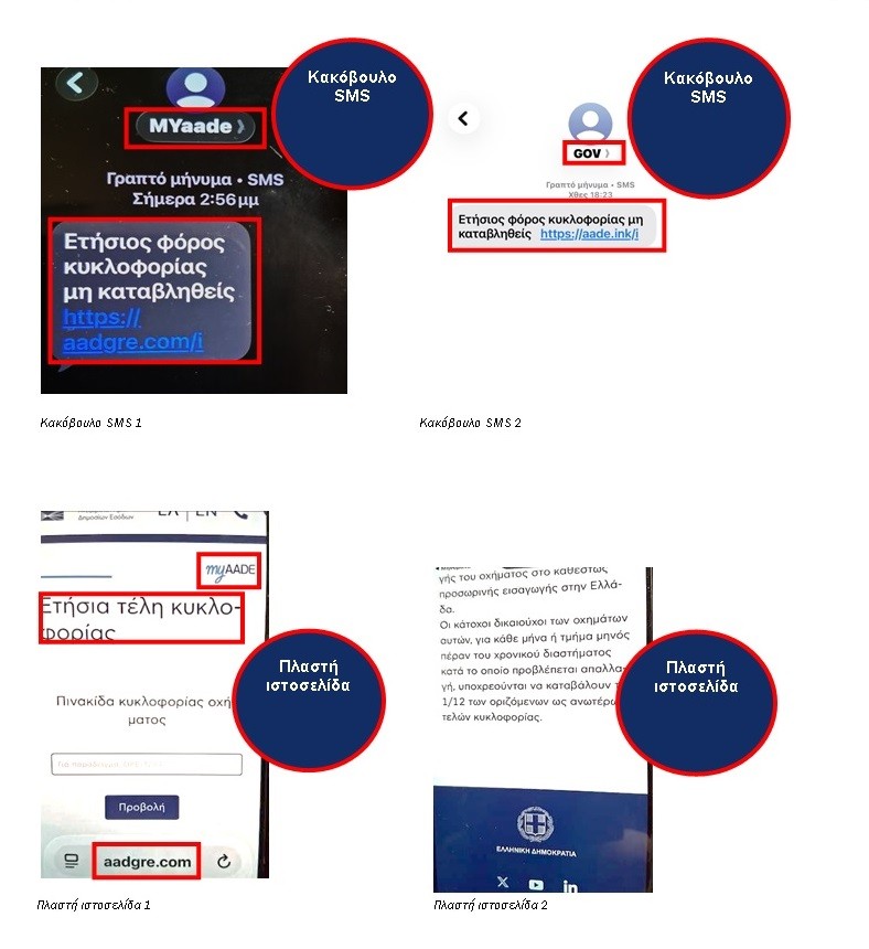 Τα μηνύματα αυτά, με την πρόφαση «μη καταβληθέντος ετήσιου φόρου κυκλοφορίας», ζητούν από τους παραλήπτες να πατήσουν σε σύνδεσμο (link) για να πληρώσουν δήθεν τέλη κυκλοφορίας οχημάτων.