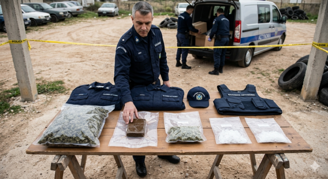 Οι Αρχές κατέσχεσαν ένα πιστόλι, ένα όπλο κρότου, 16 φυσίγγια, σιδερογροθιά, χειροπέδες, ρολόγια μεγάλης αξίας, αλλά και ρουχισμό που έφερε τα επίσημα διακριτικά της Ελληνικής Αστυνομίας, γεγονός που εγείρει σοβαρά ερωτήματα για τη χρήση του από τους κακοποιούς.