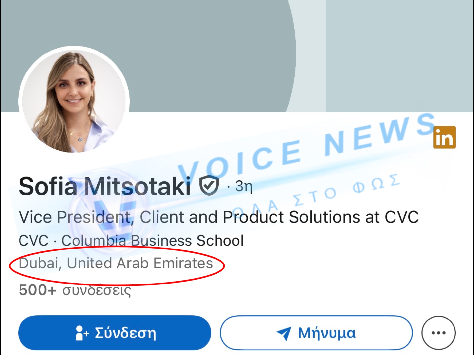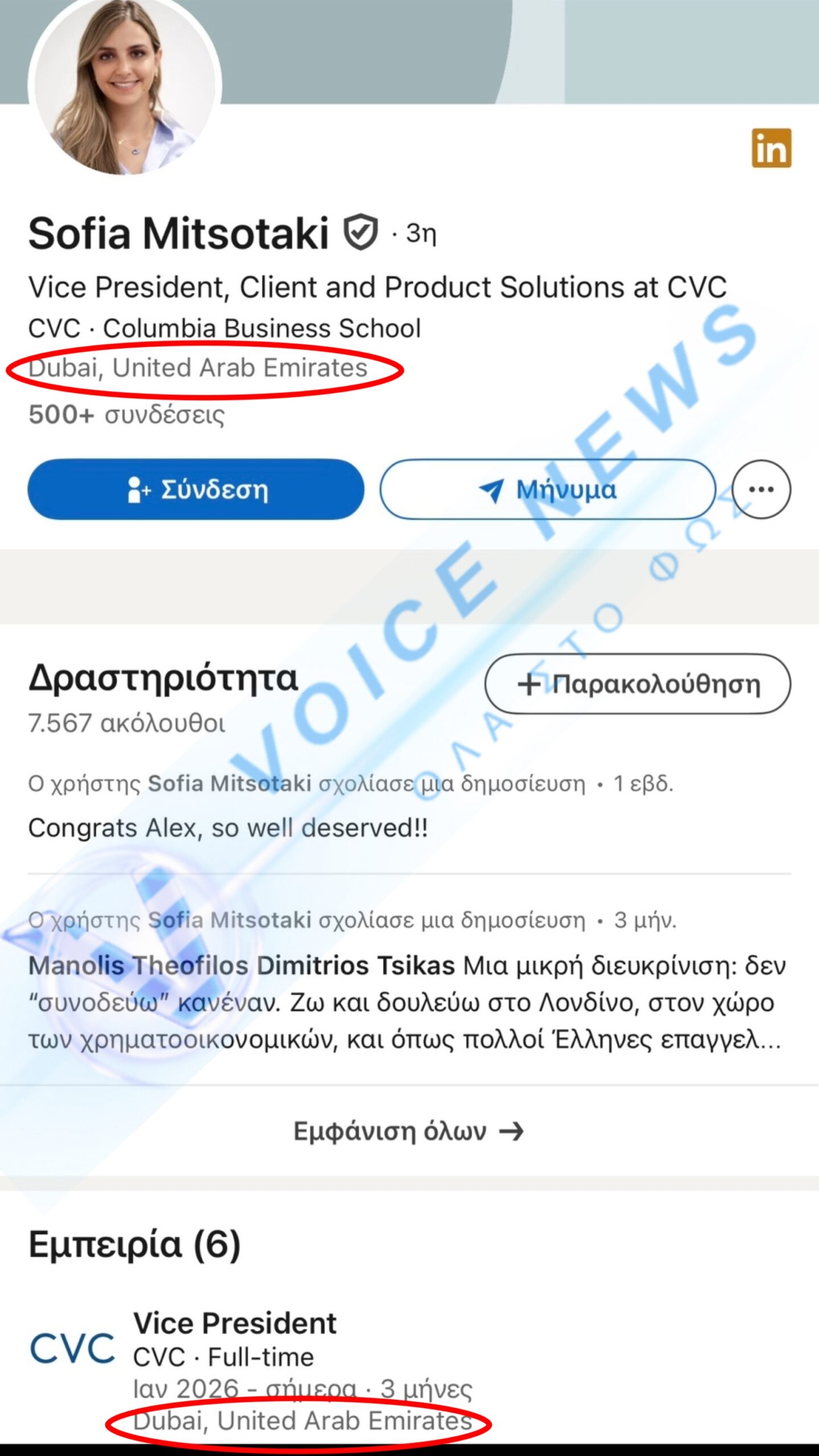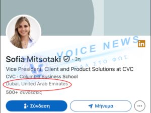 Ψάξαμε αμέσως και στο LinkedIn της Σοφίας Μητσοτάκη (κόρης του Πρωθυπουργού) αναφέρεται ξεκάθαρα: Από Ιανουάριο 2026 είναι Vice President στην CVC, με έδρα το Dubai στα Ηνωμένα Αραβικά Εμιράτα.