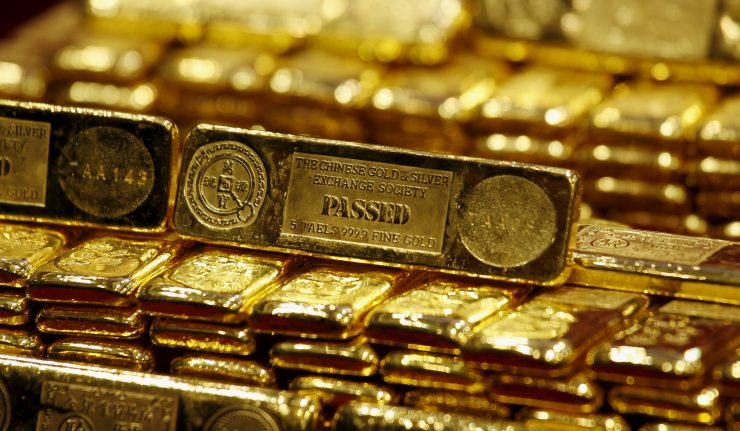 New five-tael 24K gold bars, issued by the Chinese Gold and Silver Exchange Society, Hong Kong's major gold and silver exchange, are introduced during the first trading day after the Chinese New Year holidays in Hong Kong in this February 14, 2013 file photo.  REUTERS/Bobby Yip/Files